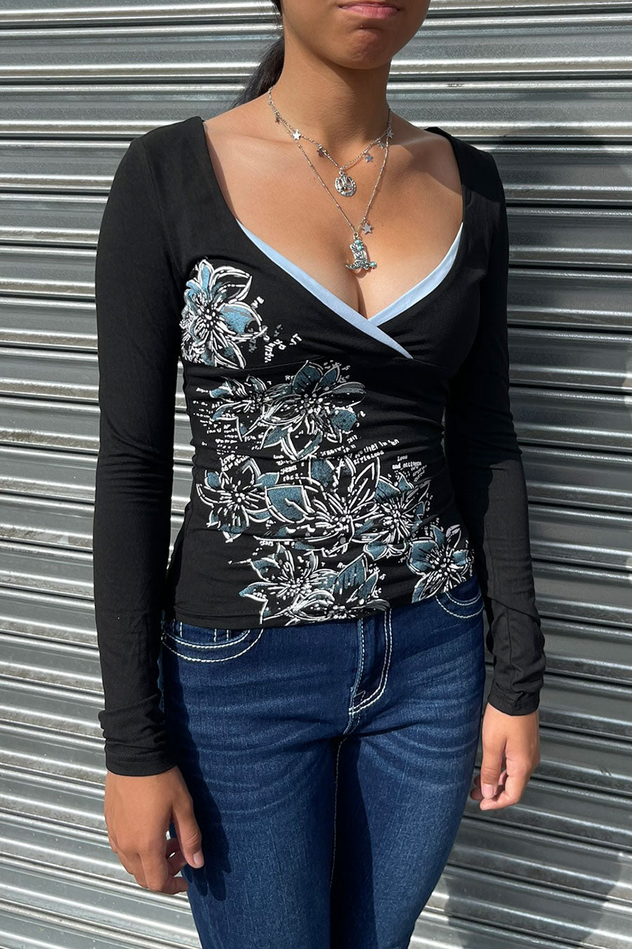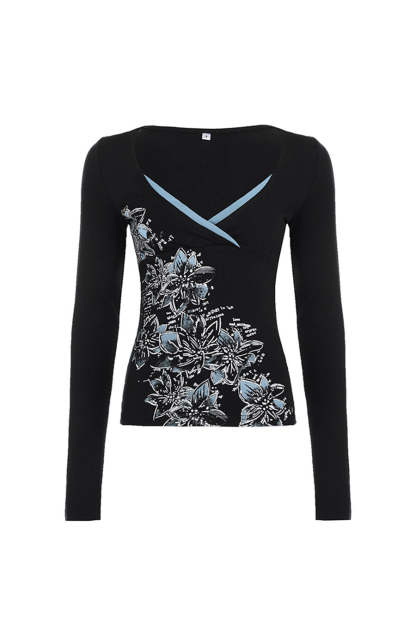 - Style Description: 2000s Floral Print Contrast Layered Long Sleeve Surplice Top