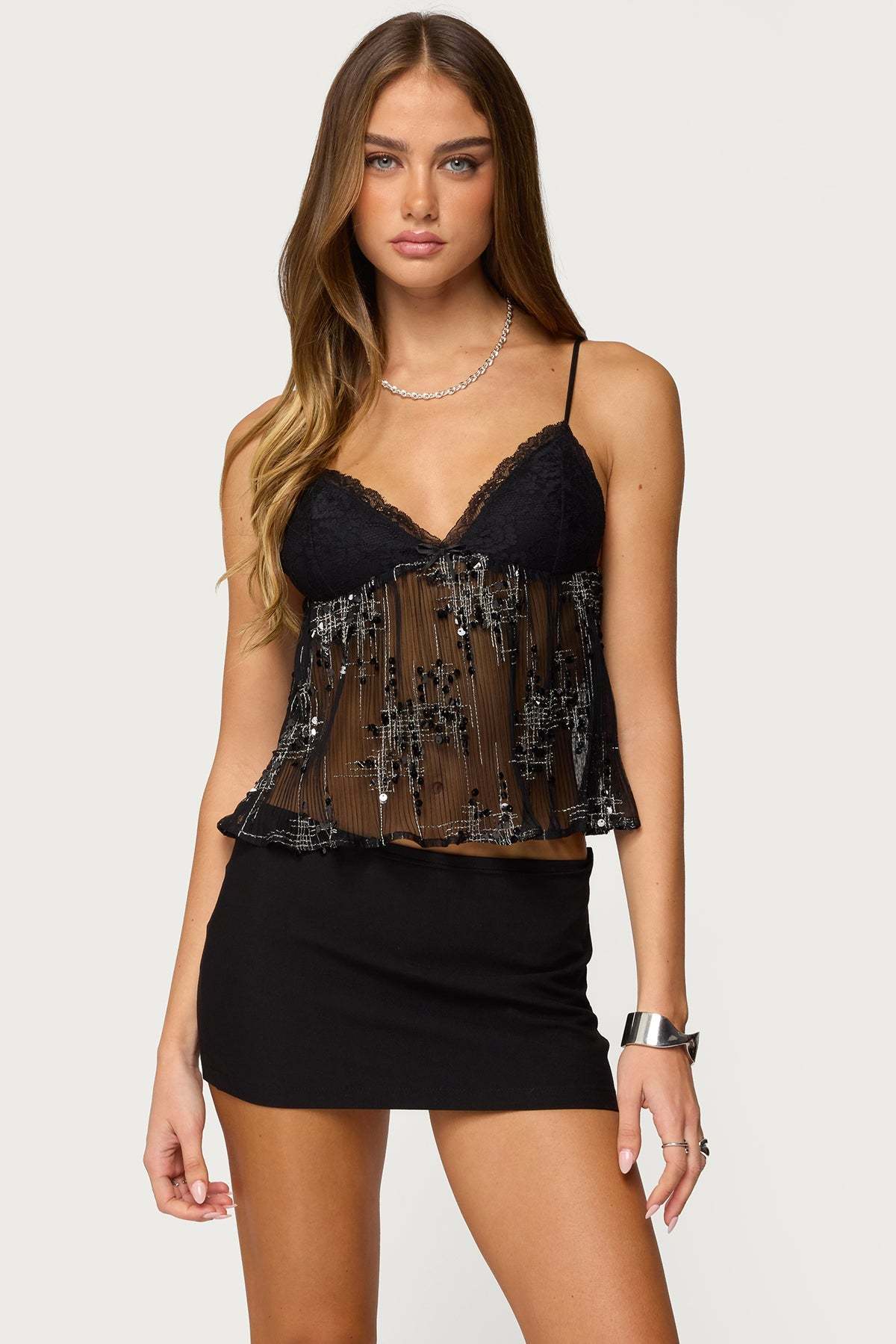 Sequin Sheer Mesh Babydoll Top