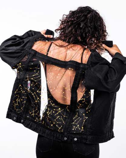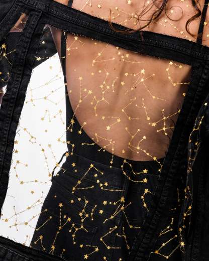 Gold Constellations. Black Mesh. Black Denim.