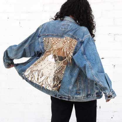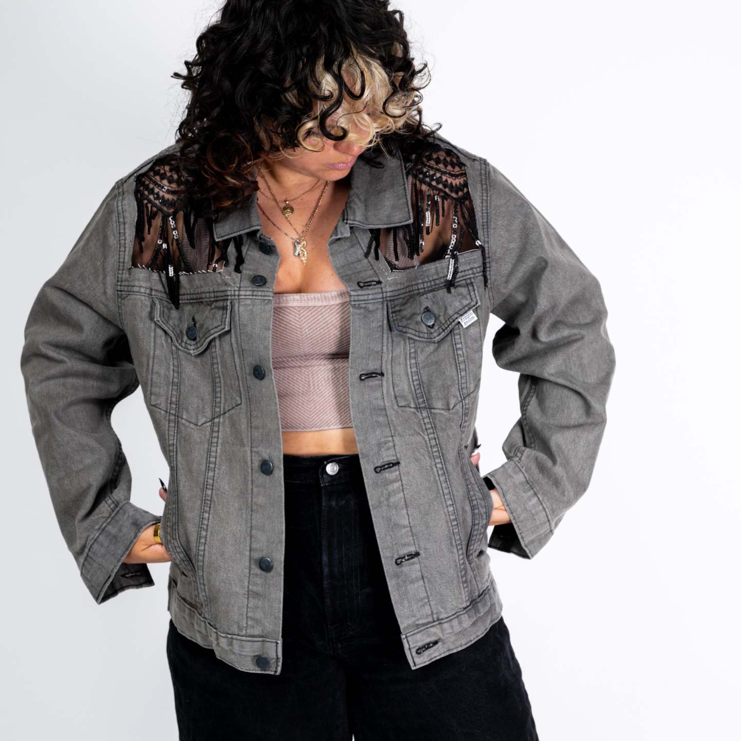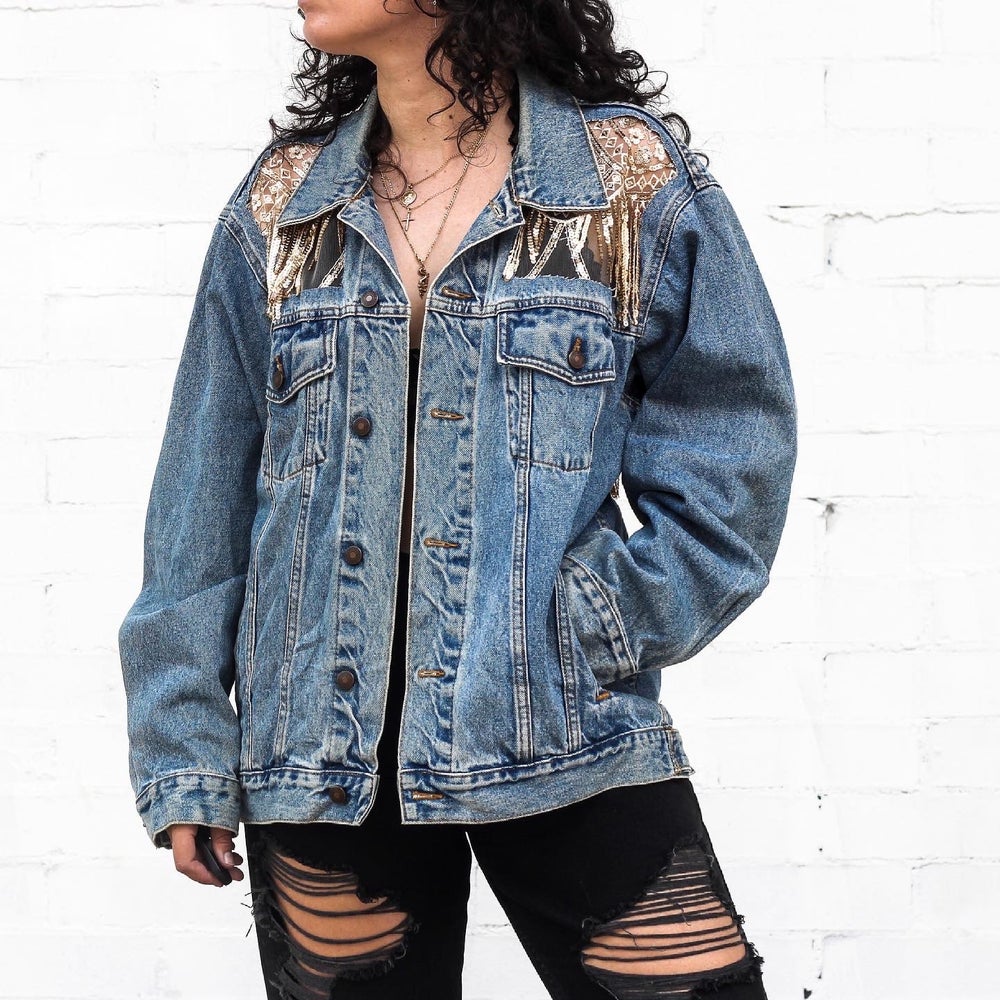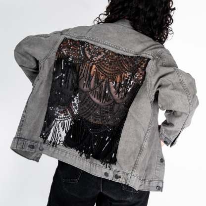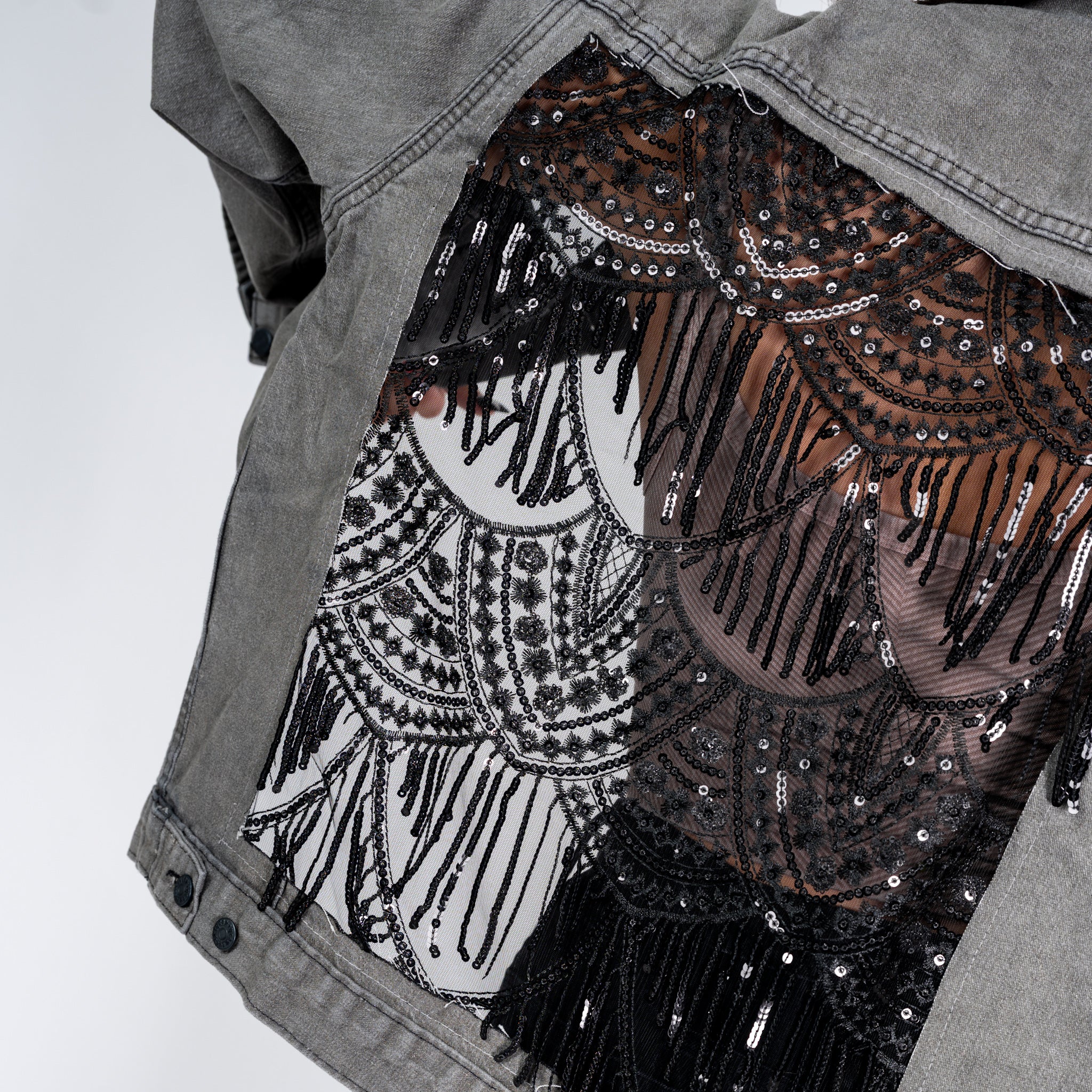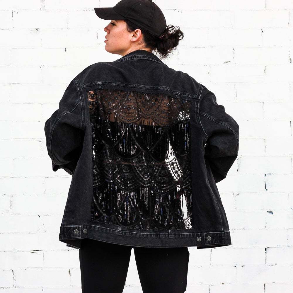 Sequin Scallops. Sequin Fringe. Blue or Black Denim.