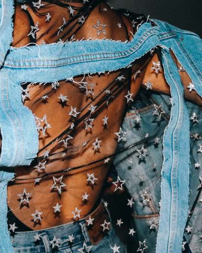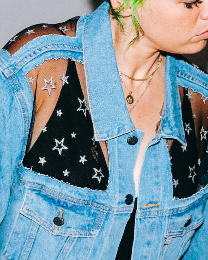 Silver Glitter Stars. Black Mesh. Blue, Black, or Grey Denim.