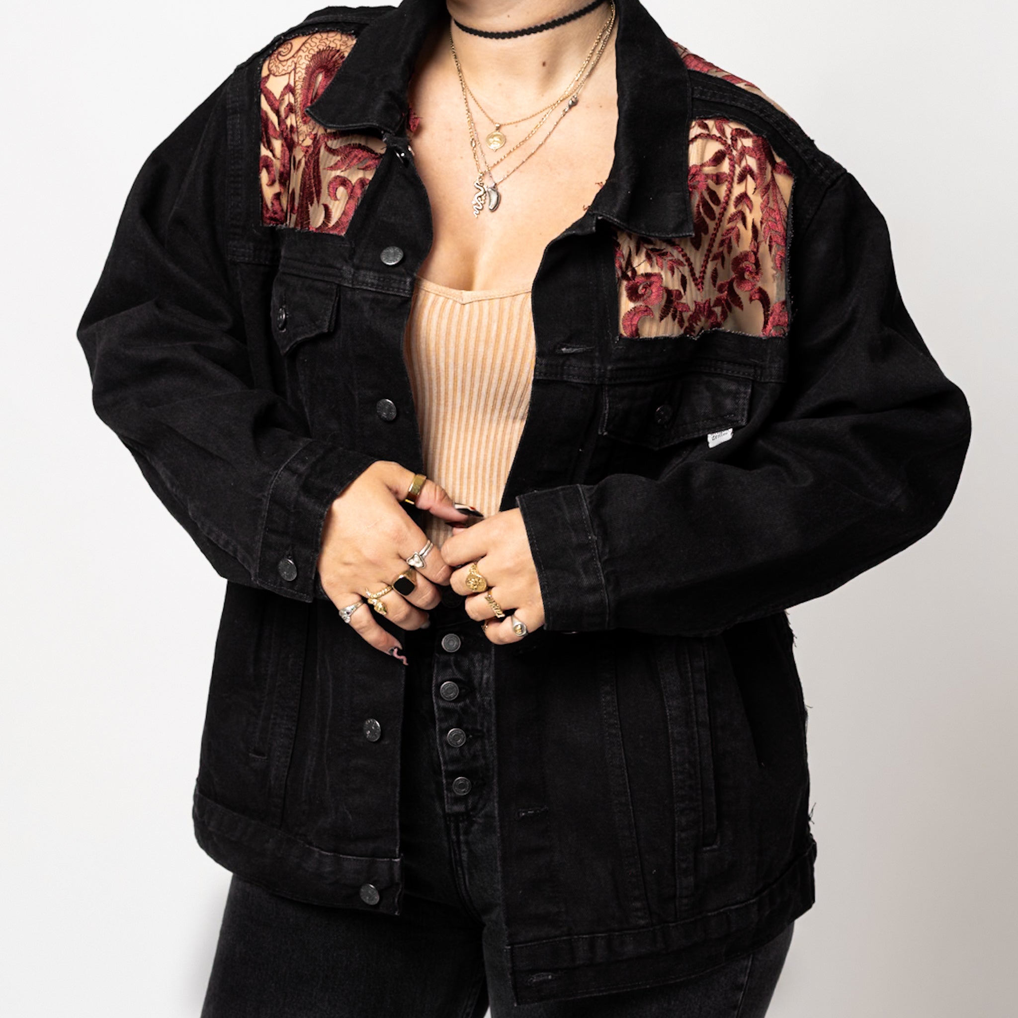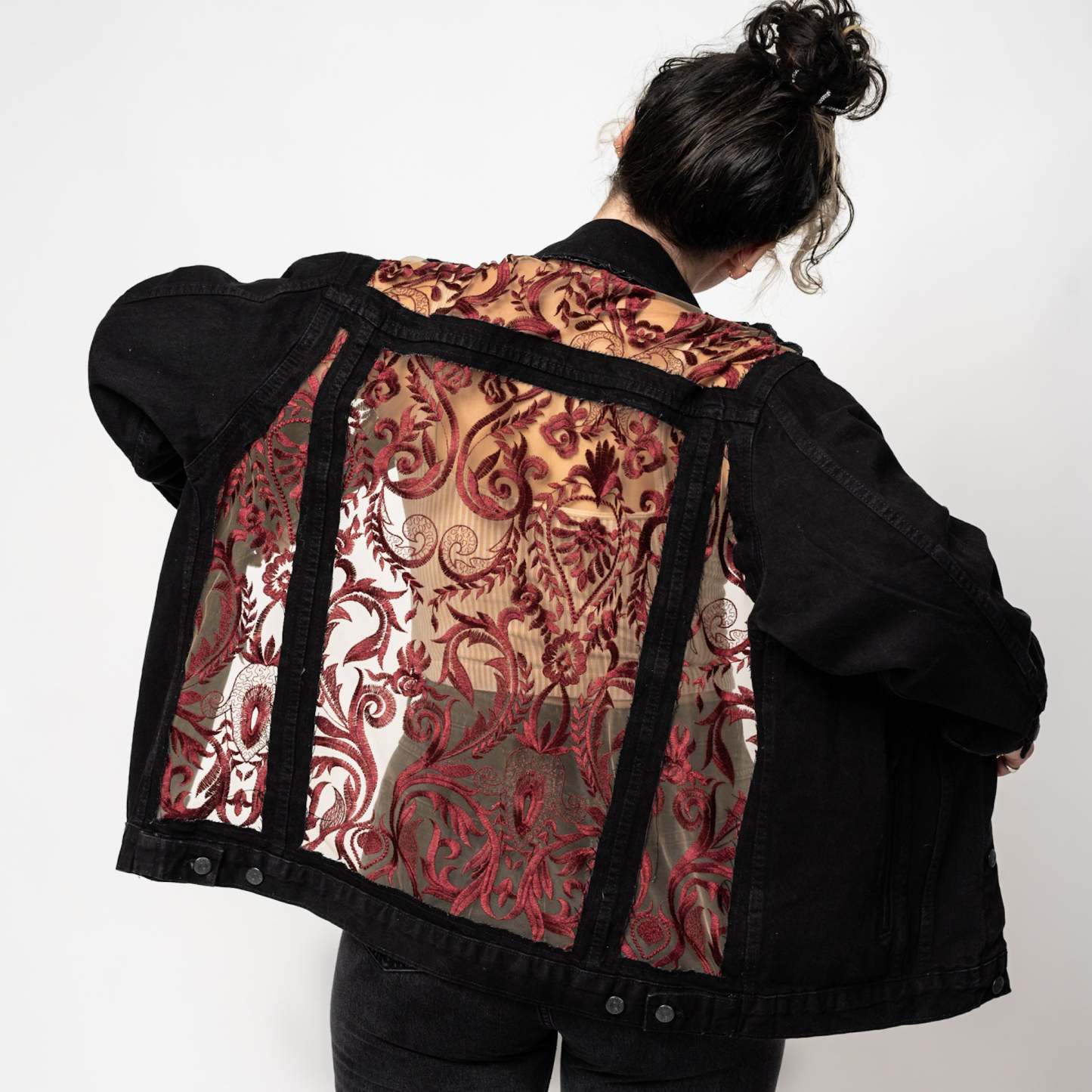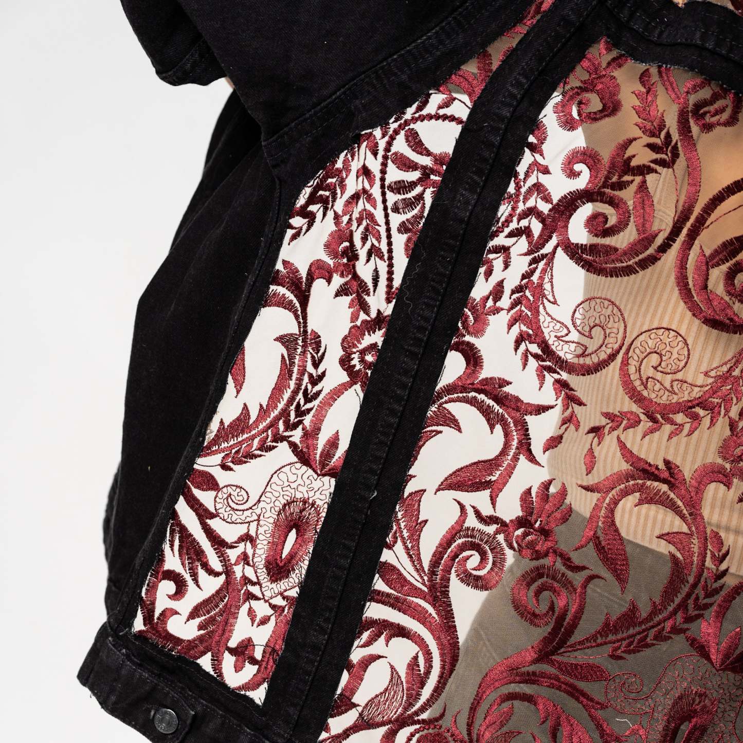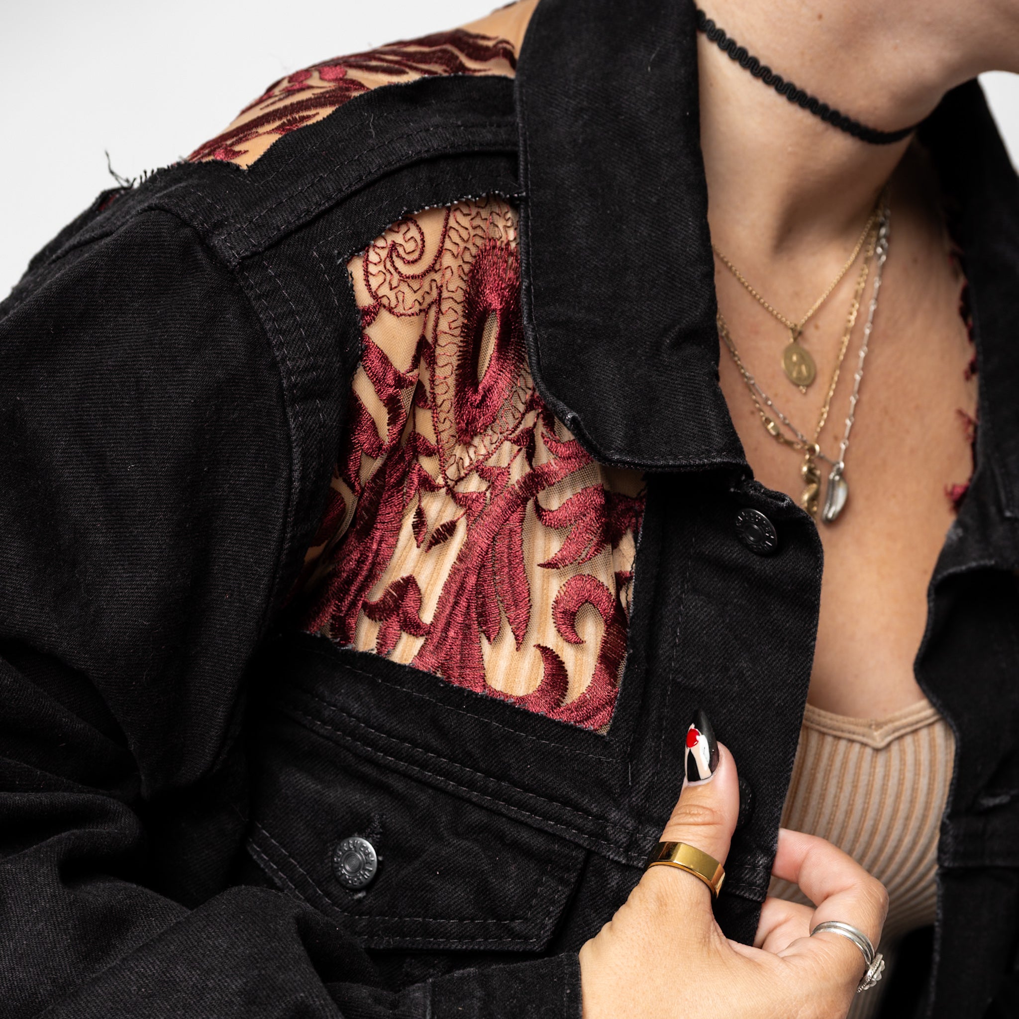 Inspired by old Italian vampire royalty. Deep red embroidery. Tan mesh. Blue or Black Denim.