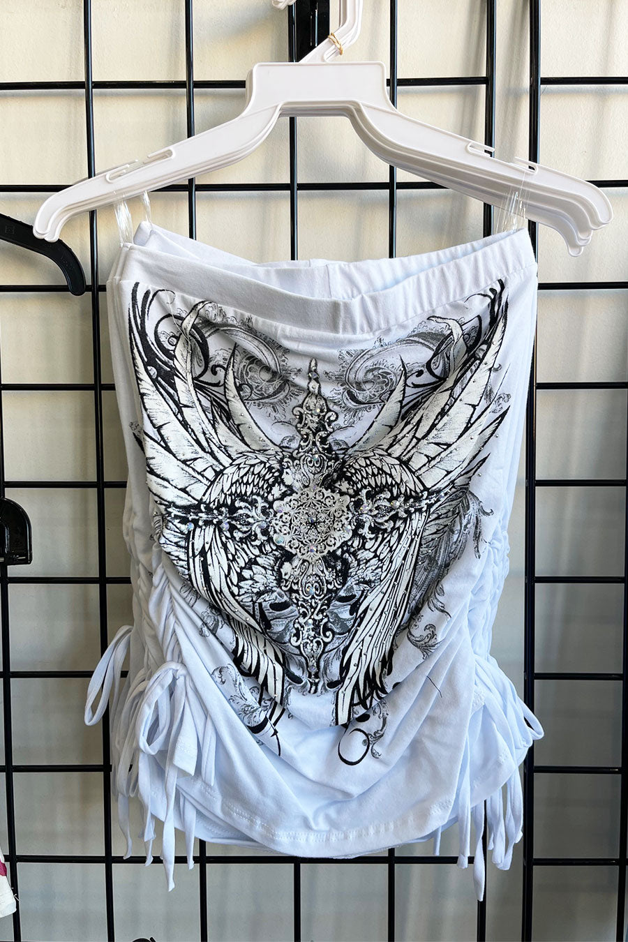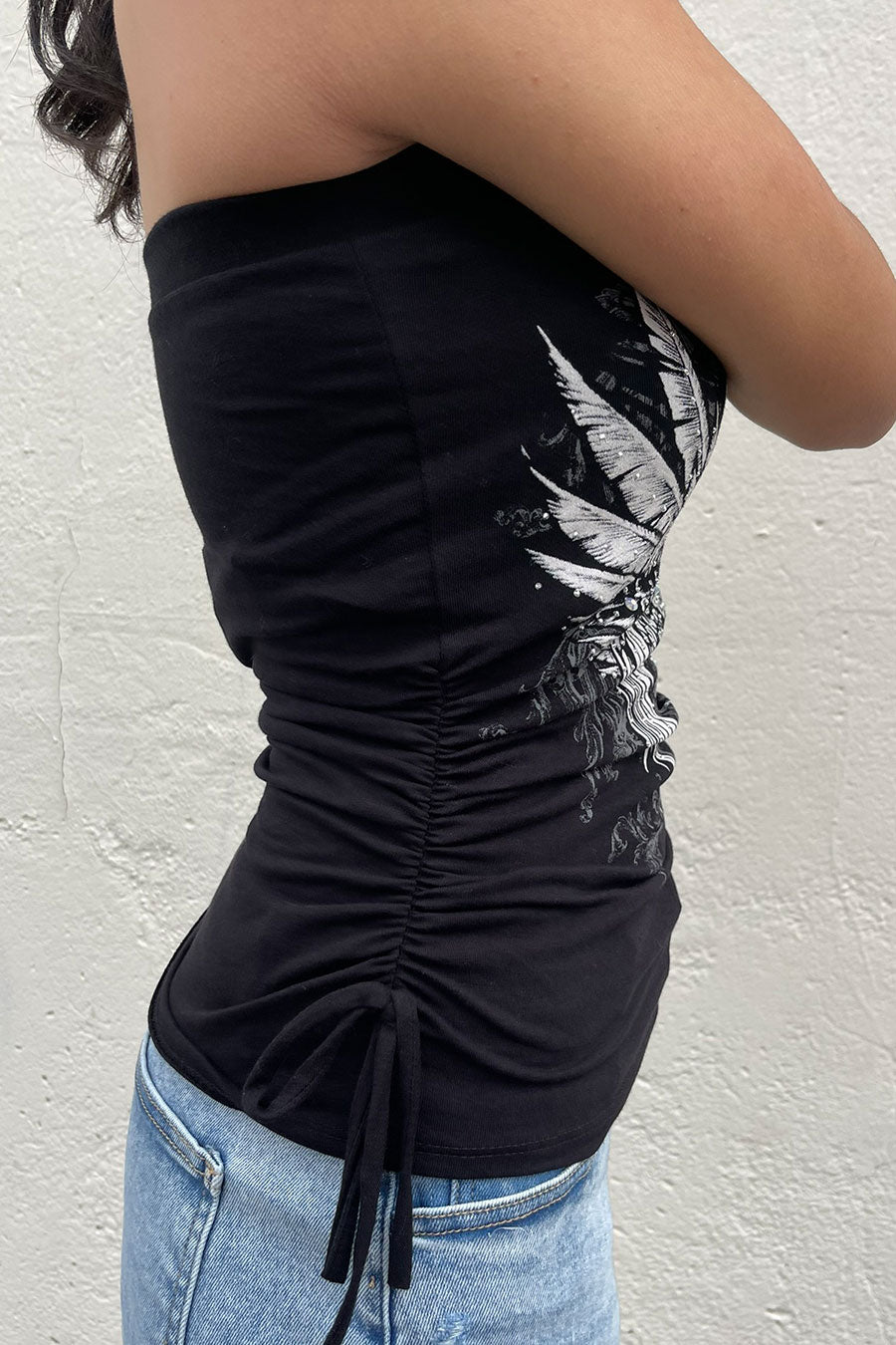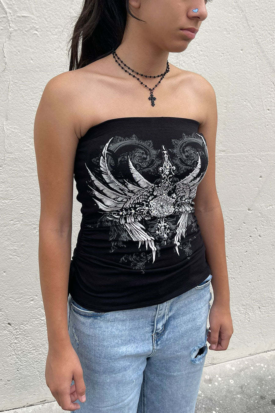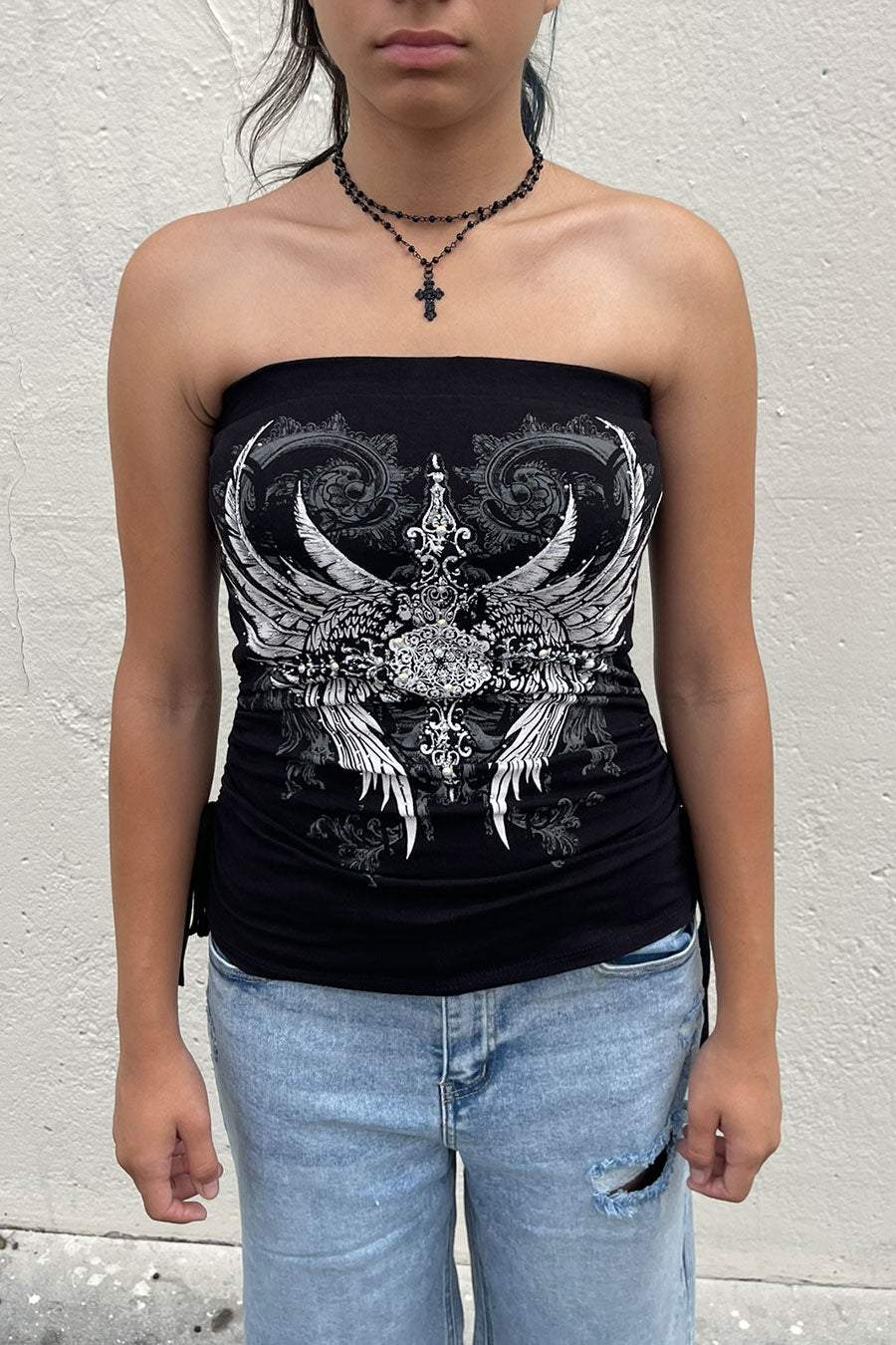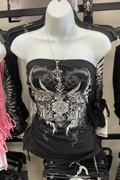 - Style Description: Y2K McBling Pierce Cross & Angel Wing RhineStone Print Side Shirred Tube Top