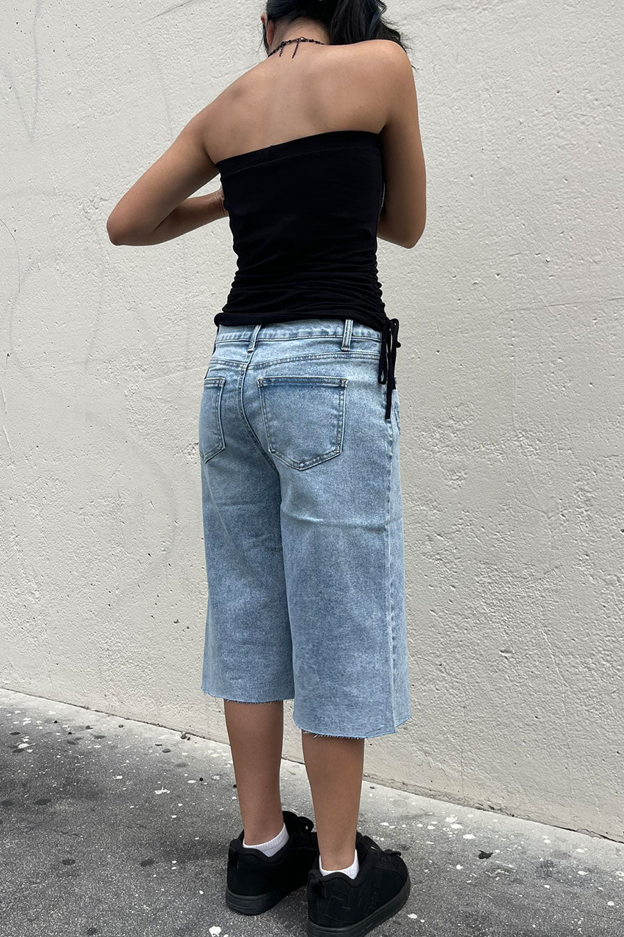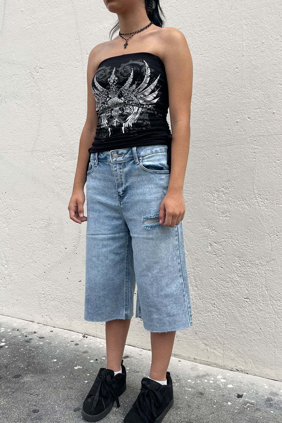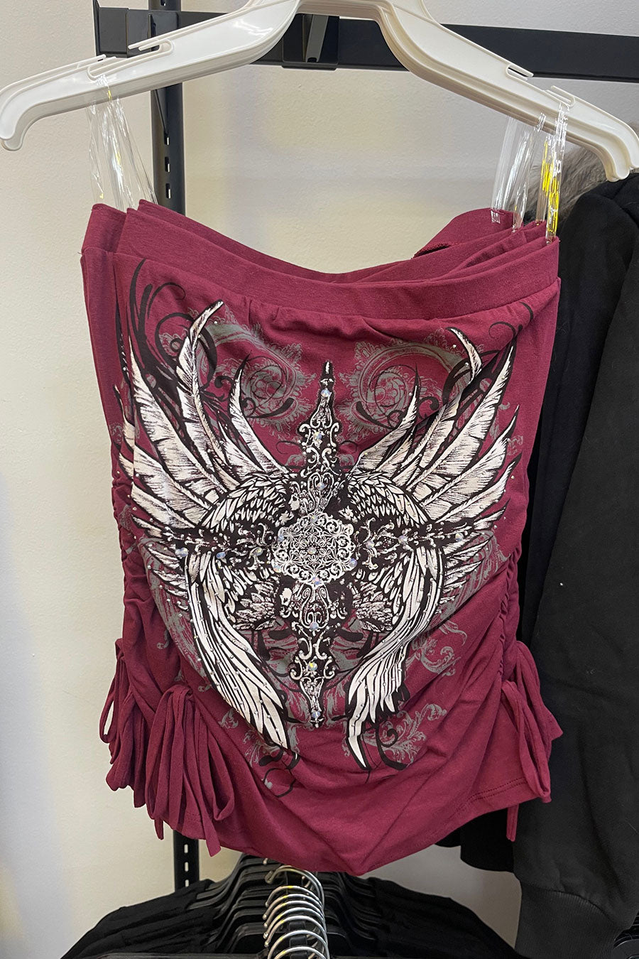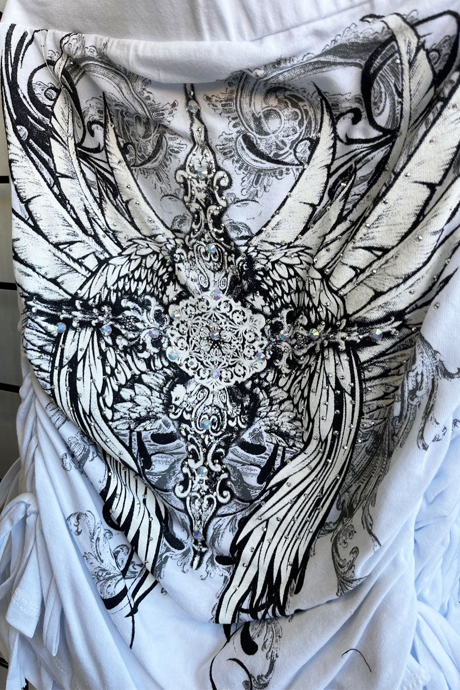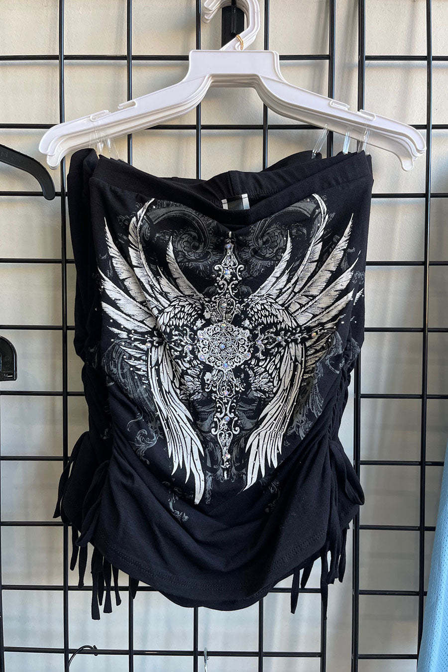 - Style Description: Y2K McBling Pierce Cross & Angel Wing RhineStone Print Side Shirred Tube Top