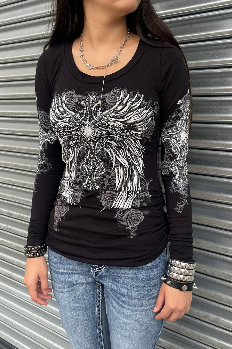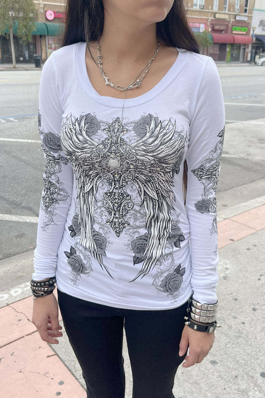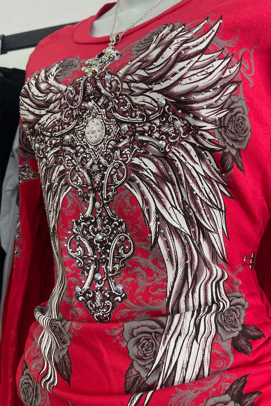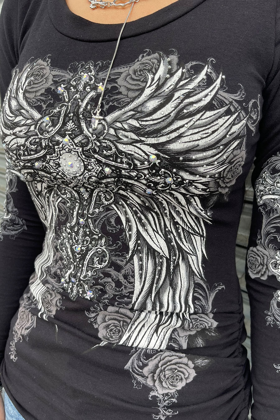 - Style Description: Y2K McBling Wing & Rose Graphic Rhinestone Print Side Shirred Long Sleeve T-Shirt