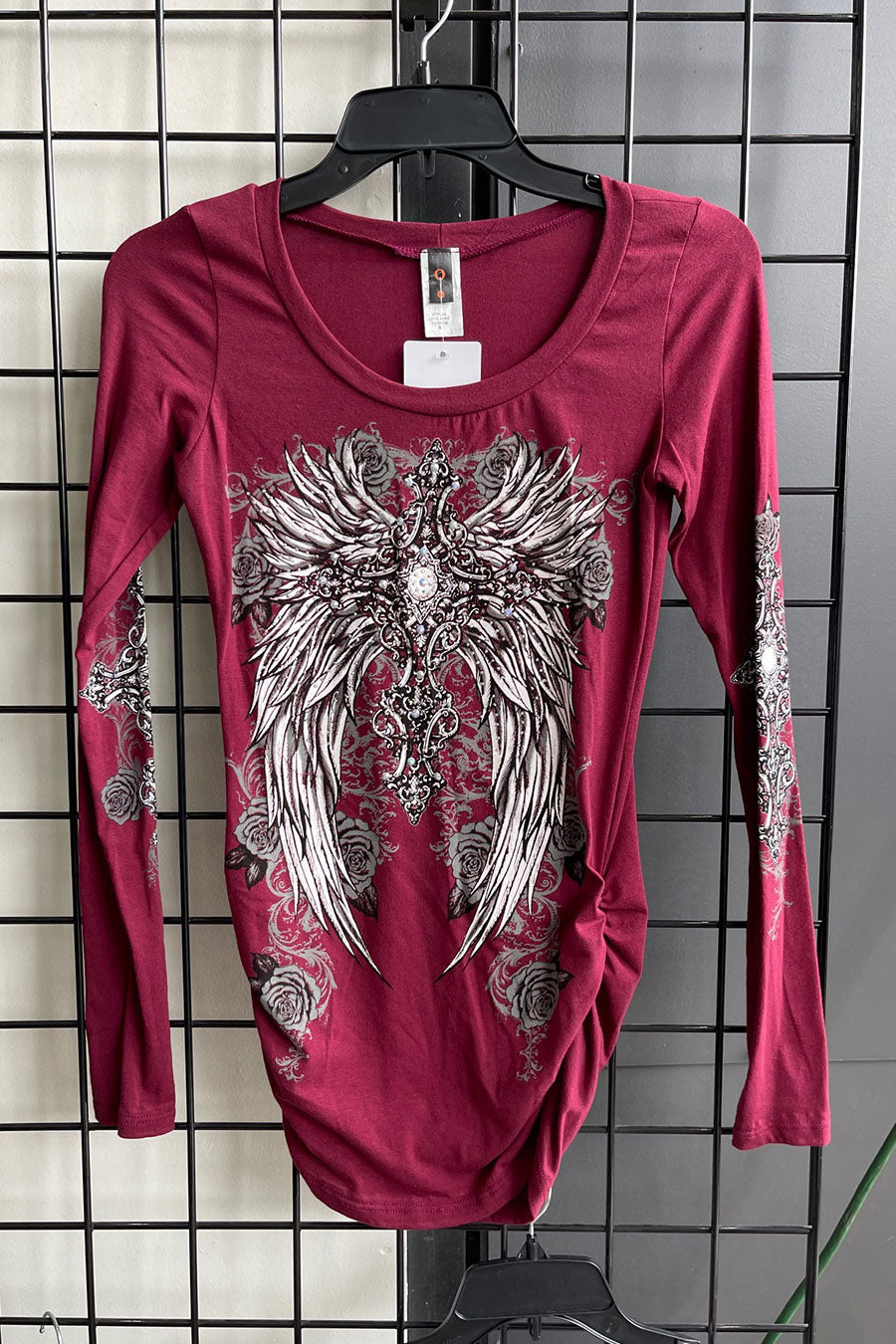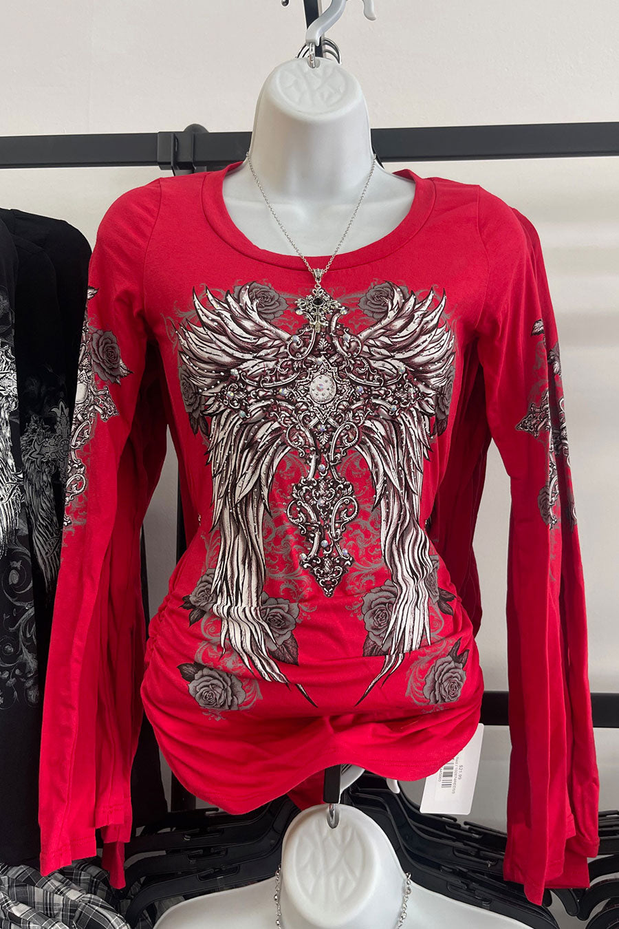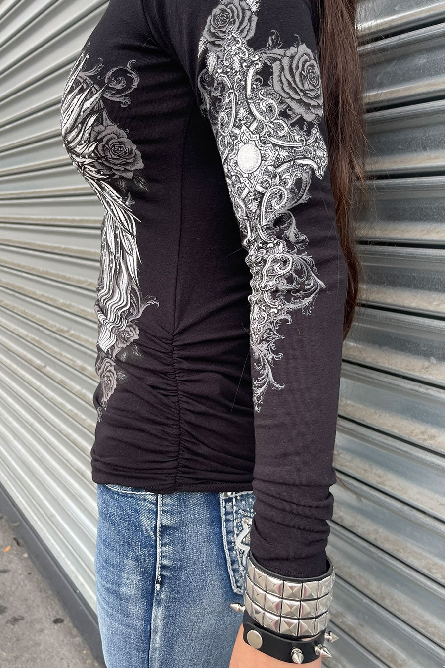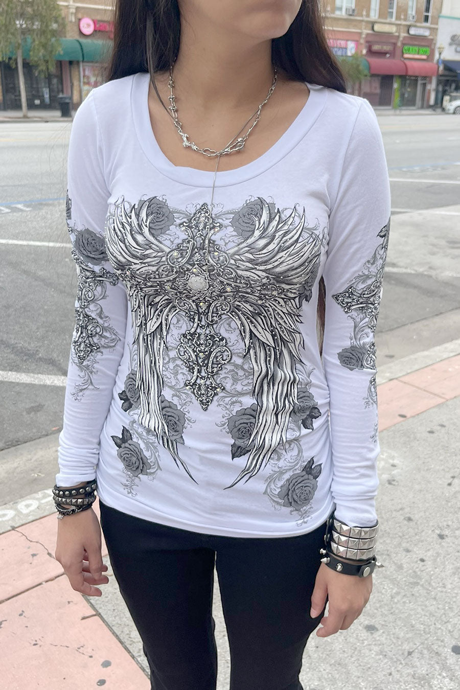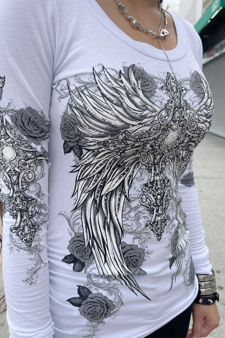 - Style Description: Y2K McBling Wing & Rose Graphic Rhinestone Print Side Shirred Long Sleeve T-Shirt