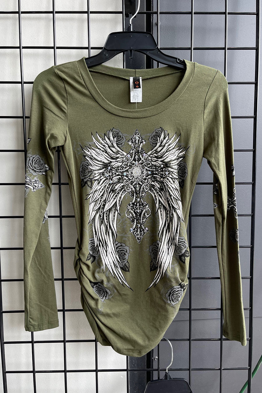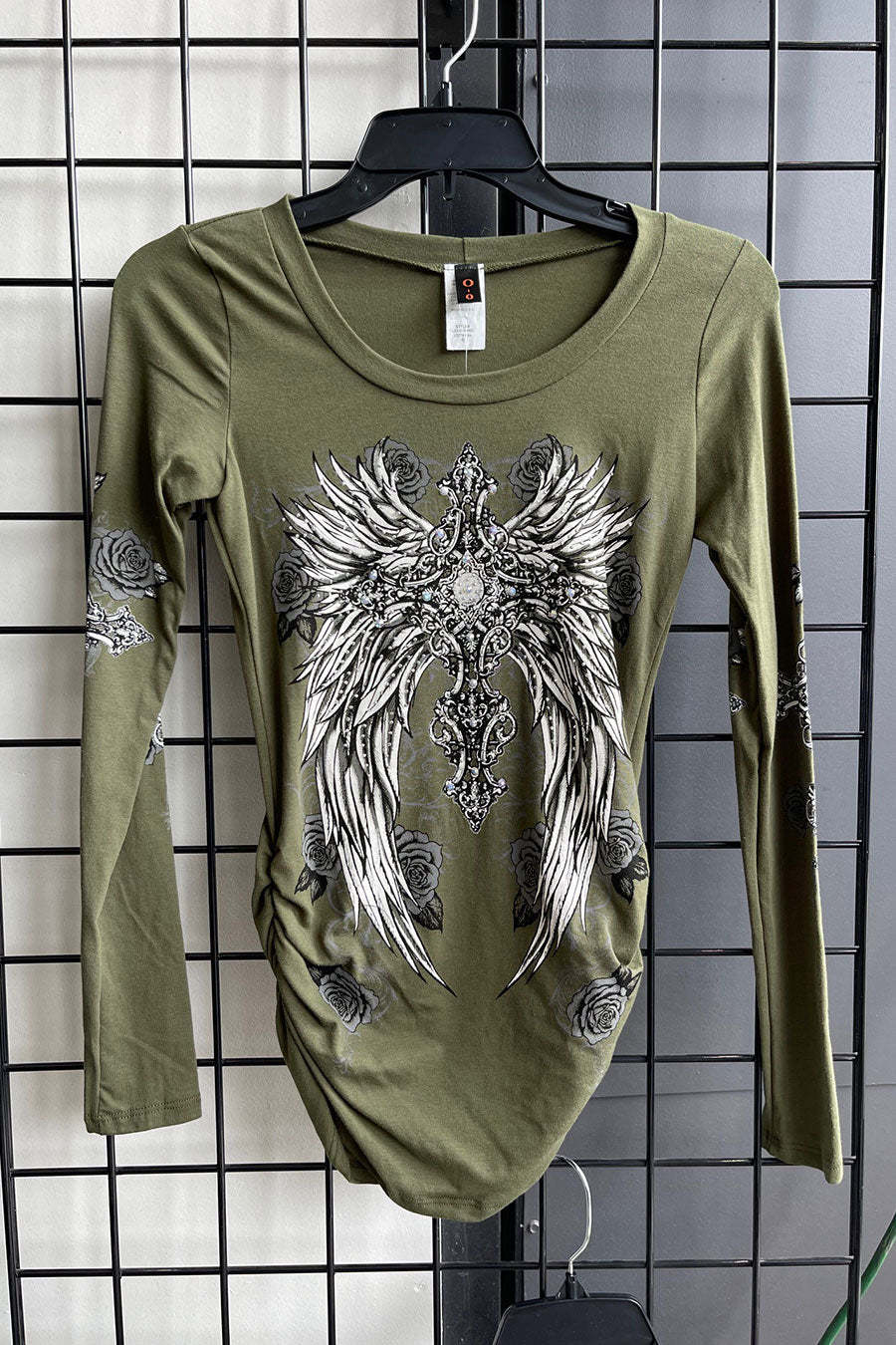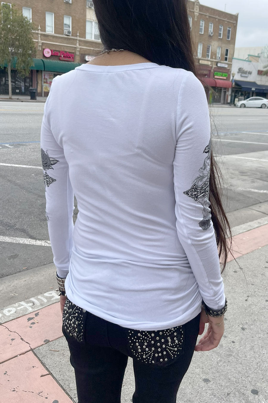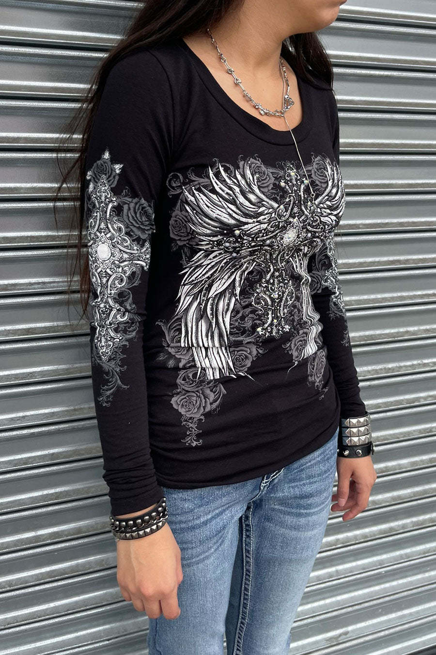 - Style Description: Y2K McBling Wing & Rose Graphic Rhinestone Print Side Shirred Long Sleeve T-Shirt