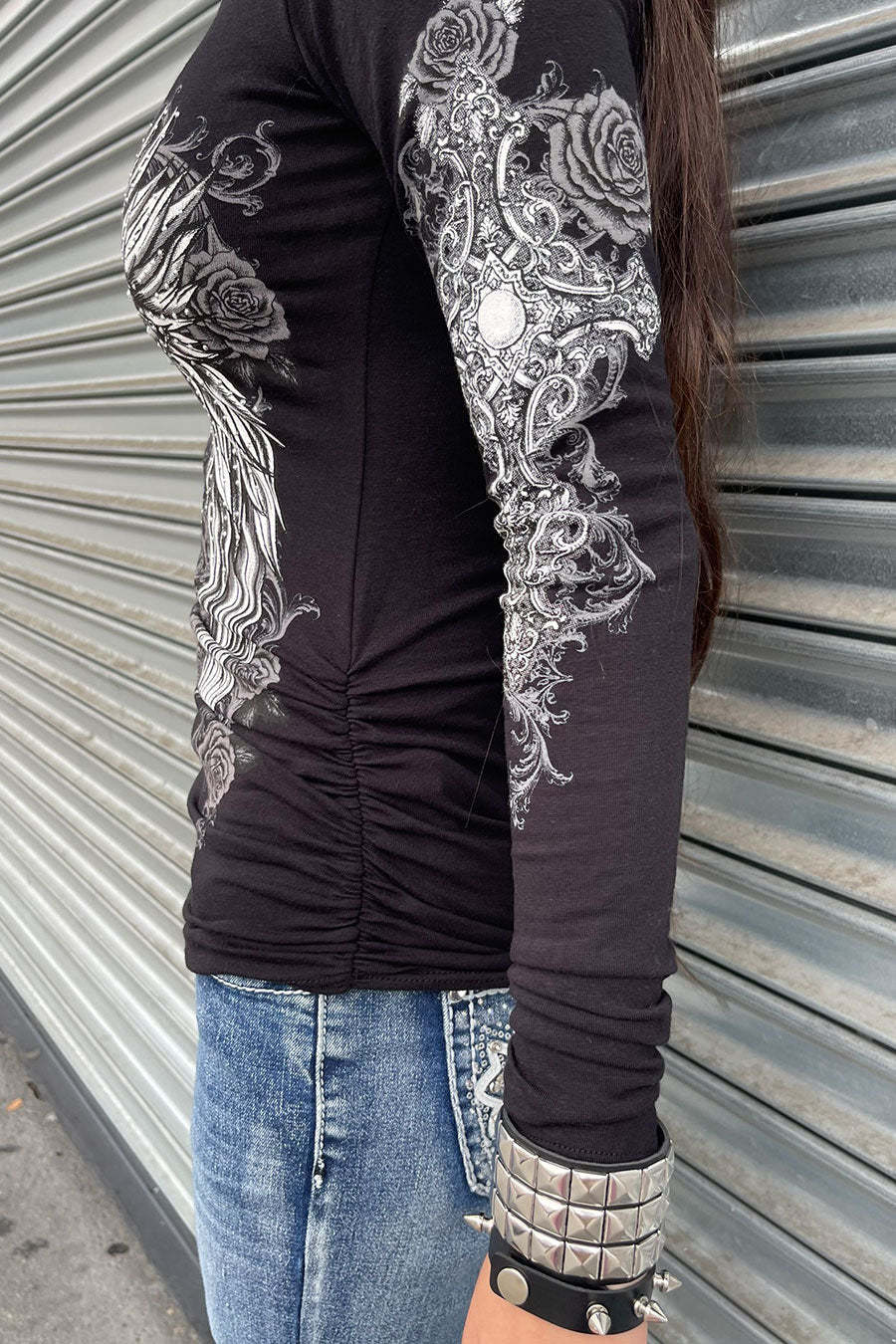 Y2K McBling Wing & Rose Graphic Rhinestone Print Side Shirred Long Sleeve T-Shirt