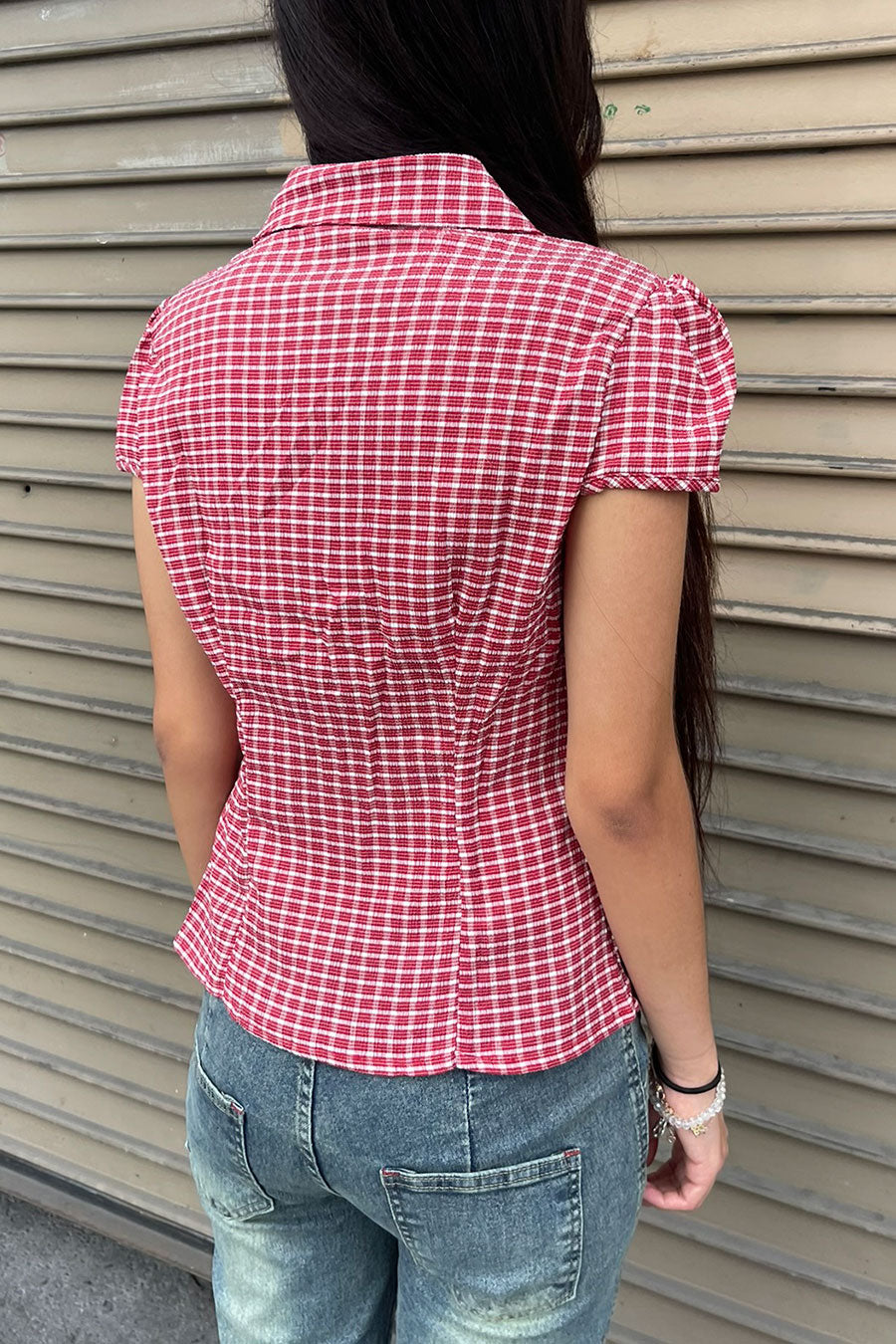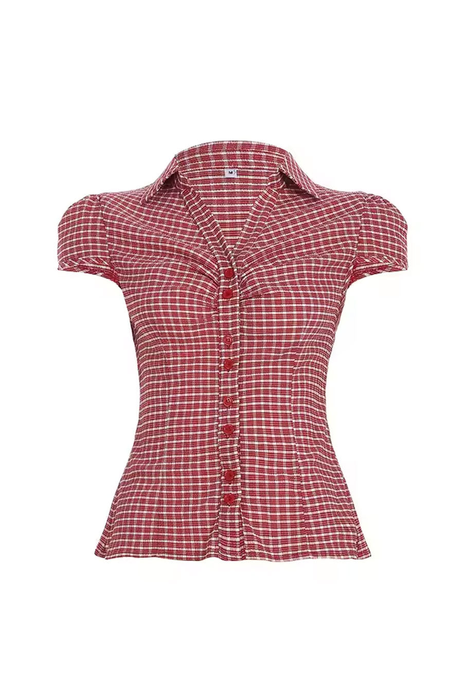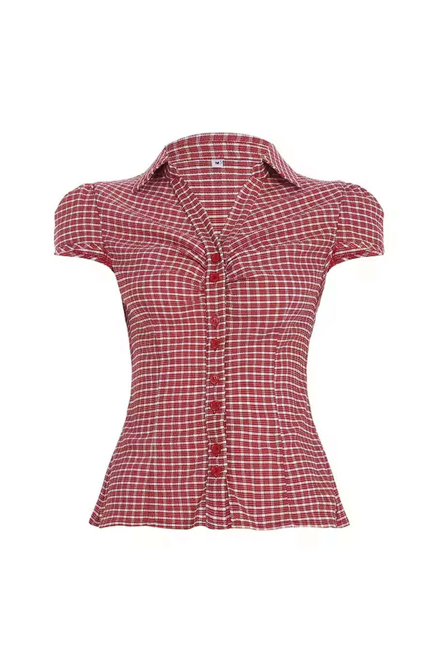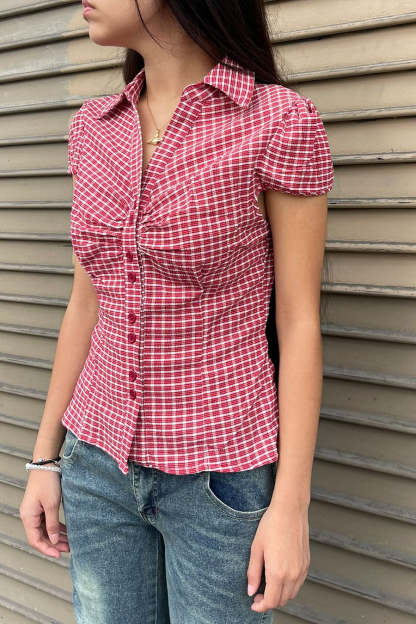 - Style Description: Y2K Red Gingham Checkered Puff Sleeve Fitted Shirt