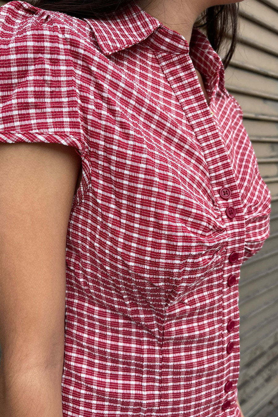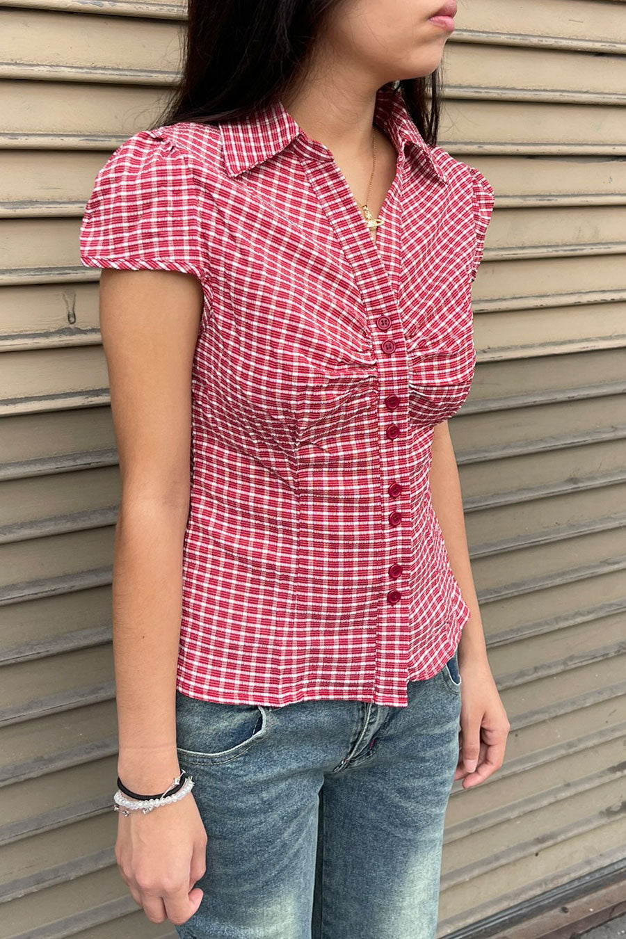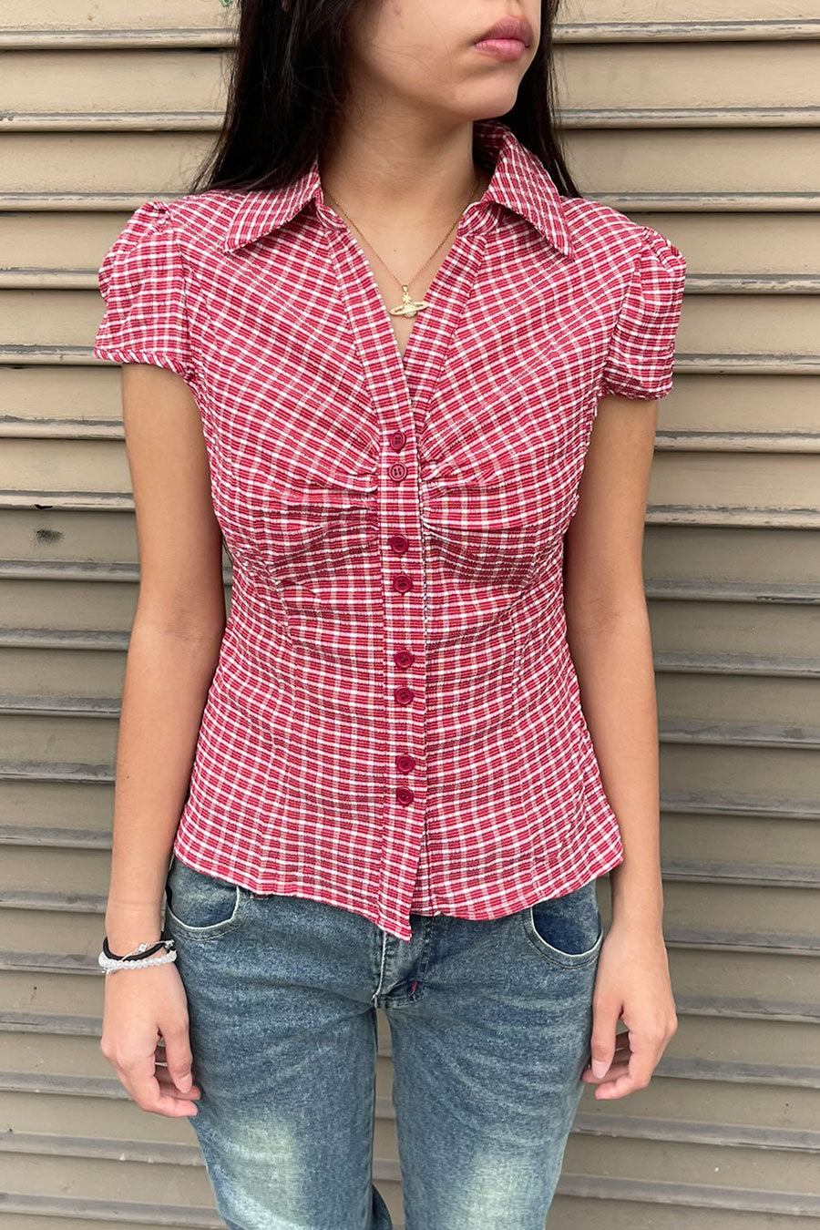 - Style Description: Y2K Red Gingham Checkered Puff Sleeve Fitted Shirt